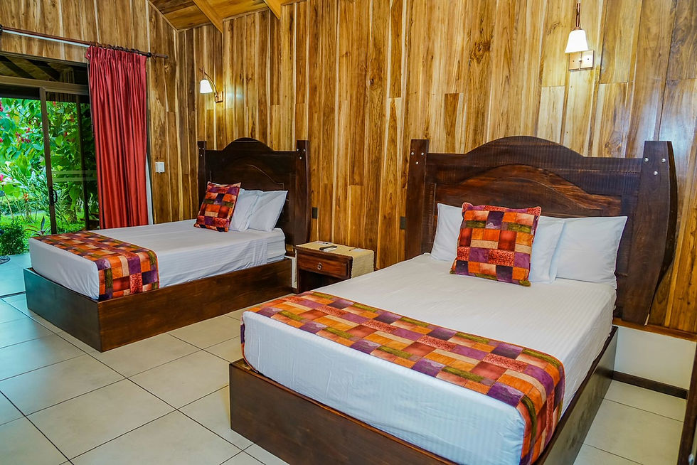 宽敞的小木屋拥有高挑的拱形天花板,四周绿树环绕,为您打造宁静私密的休憩空间。每间小木屋都配备两张舒适的大床,并以绿植隔开,确保您不会受到邻居的打扰。冰箱里备有免费饮品,步行一分钟即可到达游泳池。这里是专为舒适与宁静而设计的静谧之所。